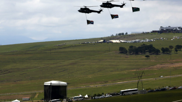 Cuando el féretro fue finalmente colocado en la tumba, helicópteros y aviones de la fuerza aérea sudafricana sobrevolaron el lugar, mientras los cañones disparaban 21 salvas como último saludo.