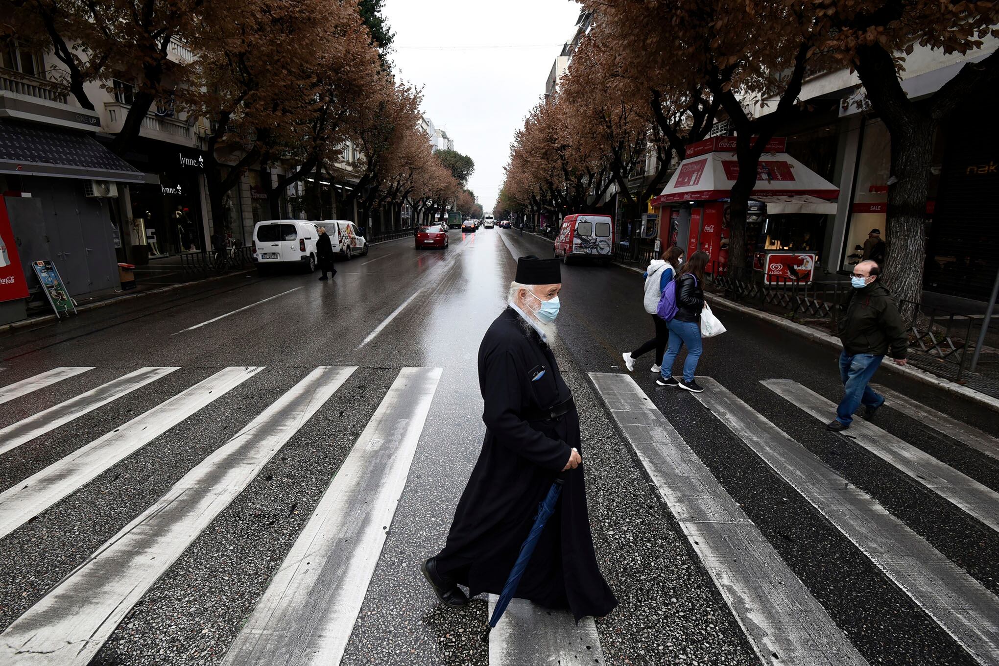 Foto: APUn sacerdote ortodoxo griego que usa una máscara facial para protegerse contra la propagación del coronavirus, camina durante el cierre para contener la propagación del COVID-19, en la calle Tsimiski, la principal zona comercial de Tesalónica, en el norte de Grecia, el martes 3 de noviembre de 2020. Foto: AP / Giannis Papanikos.