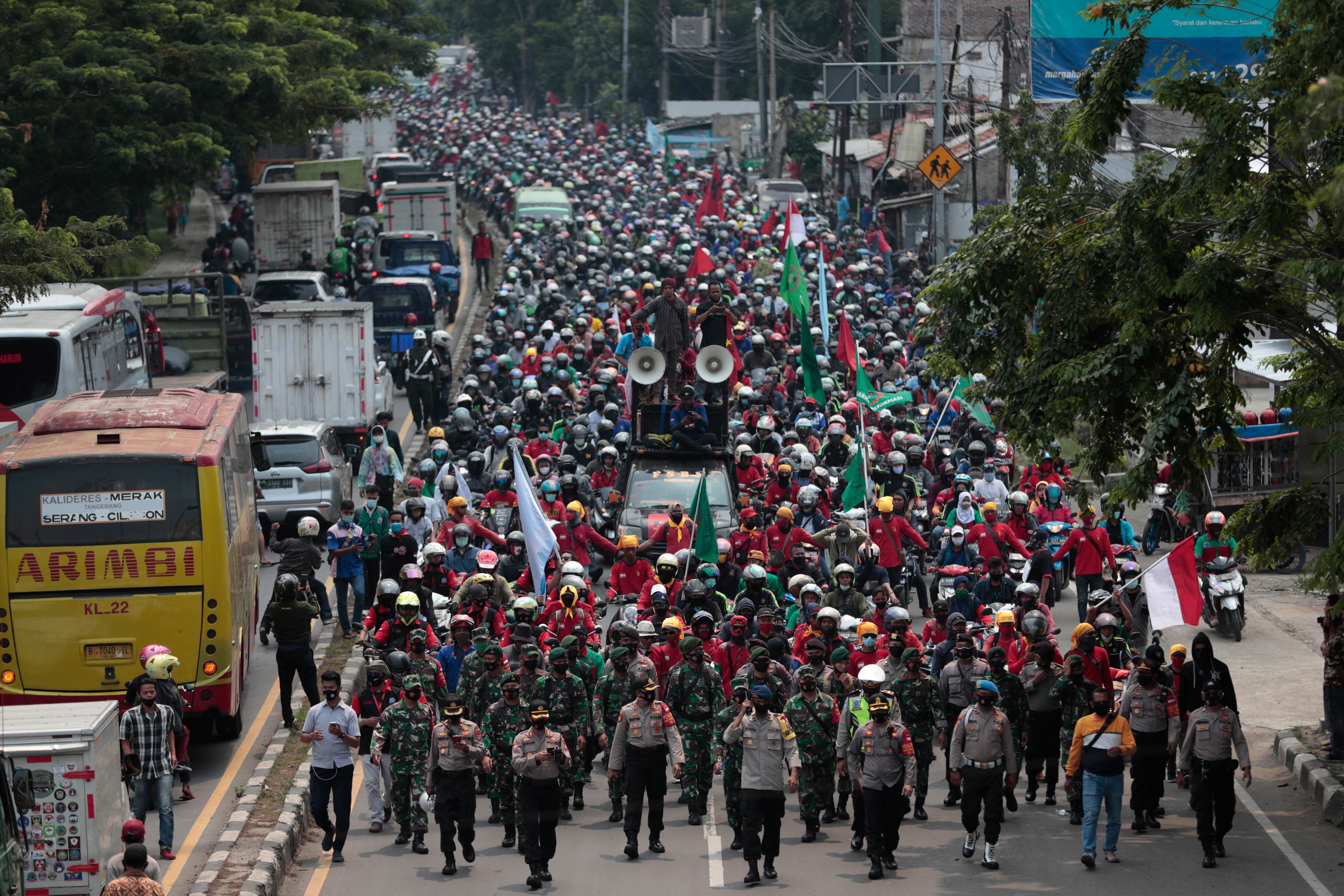 Foto: APIndonesian workers march during a protest against a controversial omnibus bill on job creation, in Tangerang, Indonesia, Wednesday, Oct. 7, 2020. Thousands of Indonesian students and laborers protested on Wednesday against the new law they say cripples labor rights and harms the environment. (AP Photo/Dita Alangkara)