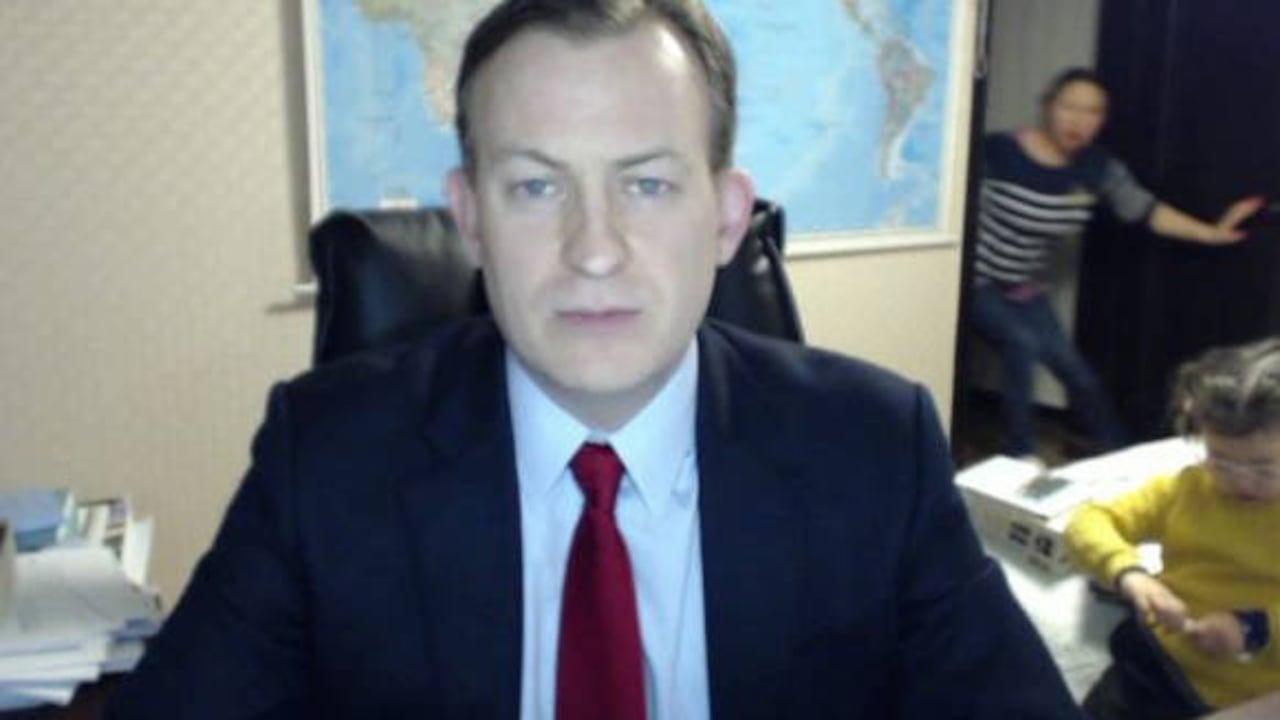 Kelly, de nacionalidad estadounidense, miraba fijamente a la cámara mientras discutía sobre el escándalo en el país asiático y no advirtió que su pequeña hija abrió la puerta de la habitación y se aproximó a él moviendo los brazos alegremente.