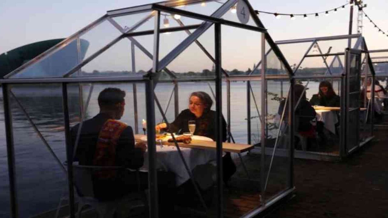 Para cumplir con las nuevas normas, un restaurante en Ámsterdam, Países Bajos, ha creado una especie de "miniinvernaderos" que pueden acomodar a los comensales, reduciendo el riesgo de exposición al virus.