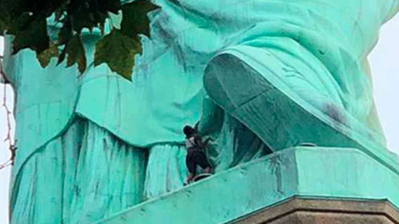 La mujer que escaló la estatua de la Libertad en forma de protesta