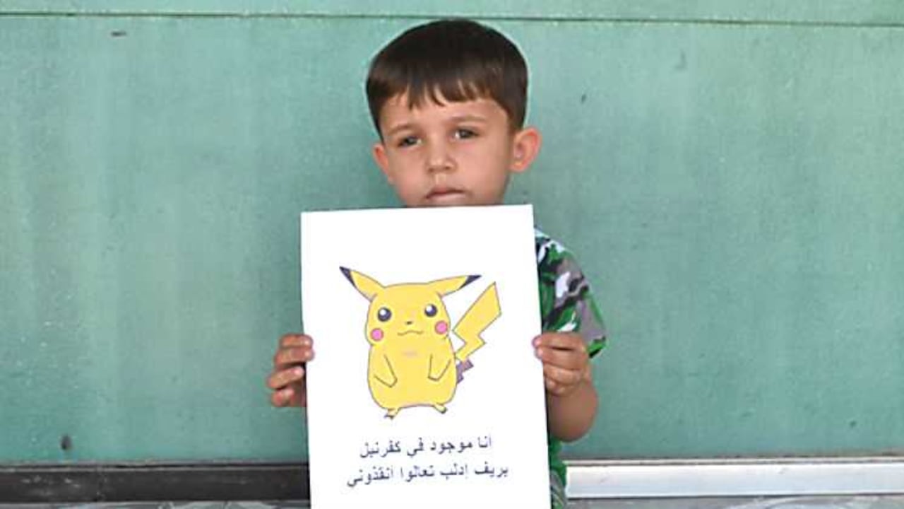 En las imágenes los niños aparecen sosteniendo un dibujo de un personaje de Pokémon con frases como "Estoy en Siria, ven a salvarme", "Estoy en Idlib, ven a por mi" o "Hay una gran cantidad de Pokemon en Siria, ven y sálvame".