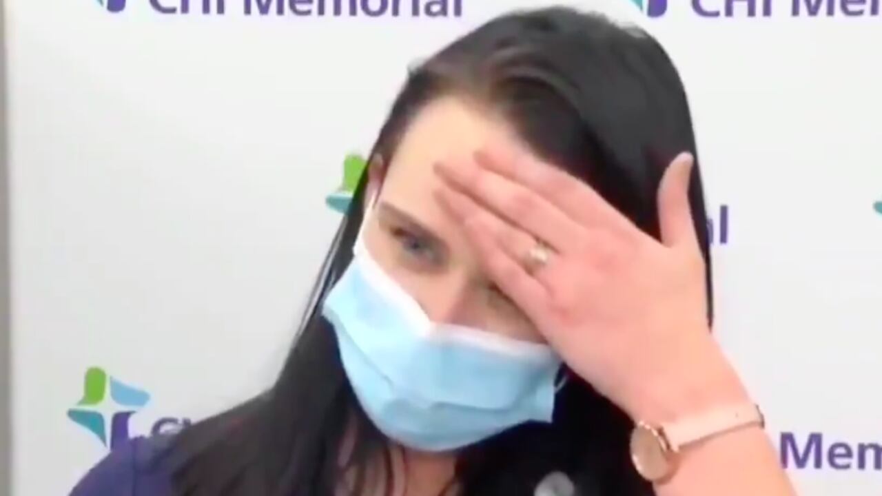 Una enfermera de Tennessee, en Estados Unidos, se desmayó minutos después de que le fuera suministrada la vacuna de Pfizer-BioNTech y mientras entregaba declaraciones a los medios de comunicación. En las imágenes se aprecia cuando la mujer se toca la cabeza tras sentir un malestar, ofrece disculpas a los presentes y cuando intenta dar unos pasos, se desmaya.