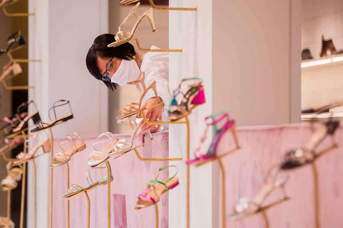 Una vendedora con protección bucal y nasal contra el coronavirus decora el escaparate de una zapatería en Münster, Alemania. Rolf Vennenbernd-A través de AP