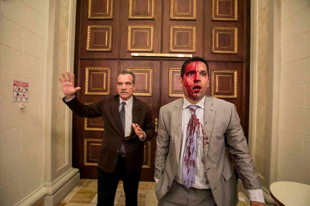 Hombres conversan junto a una pared manchada de sangre en la sede de la Asamblea Nacional hoy, miércoles 5 de julio de 2017, en Caracas, Venezuela. Un grupo de simpatizantes del chavismo, con palos y armas de fuego, se tomó los accesos del lugar e ingresó a la fuerza dejando a varios diputados y asistentes heridos. EFE/CRISTIAN HERNÁNDEZ