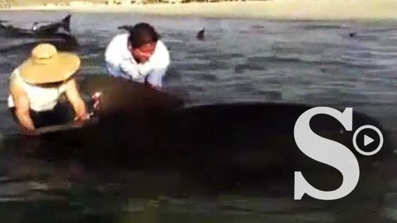 Sólo tres ballenas, de 27 que quedaron varadas en una playa de México, lograron sobrevivir tras 15 horas de rescate, luego de que la marea baja impidiera que regresaran a aguas profundas.