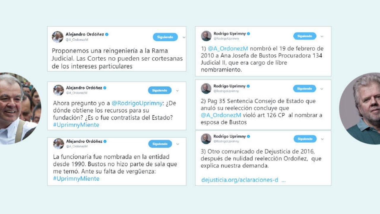 Las redes sociales del jurista y columnista Rodrigo Uprimny se inundaron de ataques del exprocurador Alejandro Ordóñez, María Fernanda Cabal y Ernesto Yamhure. Estos y otros uribistas viralizaron con furia el hashtag #Uprimnymiente. Todo comenzó con la discusión en que un día antes se enfrascó Ordóñez cuando el periodista Néstor Morales le cuestionó al aire haber nombrado en la Procuraduría a la exesposa del magistrado Leonidas Bustos, protagonista del escándalo de corrupción de la Corte Suprema.