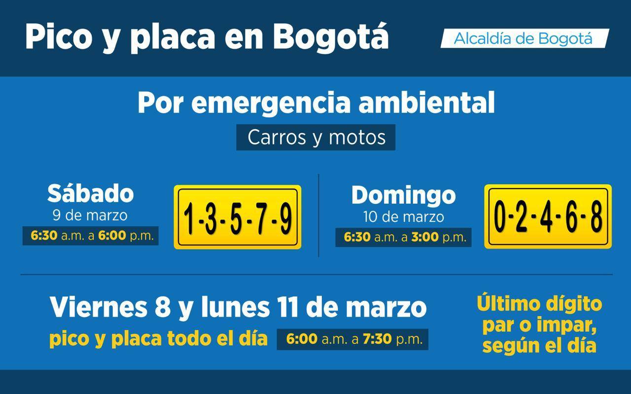 El secretario de movilidad, Juan Pablo Bocarejo, por su parte explicó que las medidas que se tomarán en movilidad serán similares a las de la alerta que se vivió hace unos días. Desde el viernes 8 de marzo hasta el lunes 11 de marzo va a haber restricción de pico y placa para los carros y motos en horario extendido, es decir, desde las 6 de la mañana hasta las 7:30 de la noche. El viernes inician los vehículos pares. El sábado, de 6:30 de la mañana hasta las 6 de la tarde, los impares. El domingo la restricción será de 6:30 de la mañana a 3 de la tarde para vehículos pares y el lunes en horario extendido para vehículos impares.