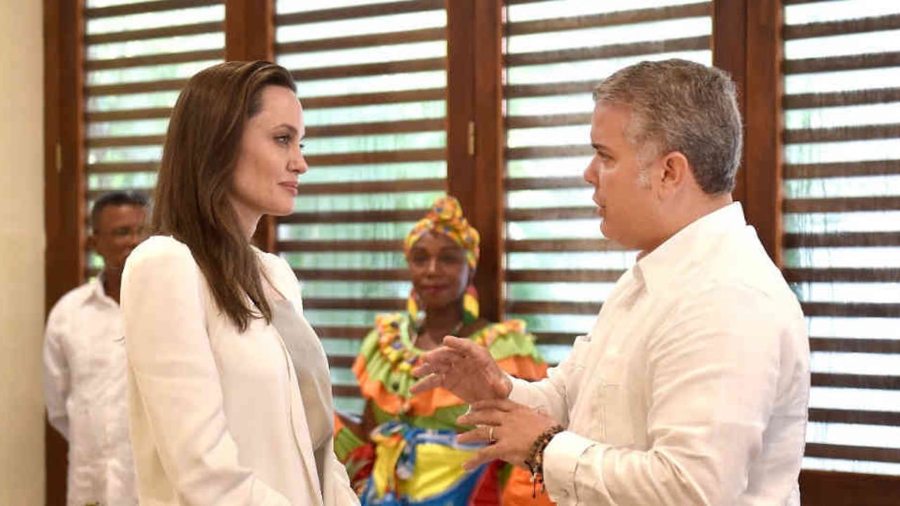 La actriz Angelina Jolie continúa su visita por el país y tras su paso por La Guajira, hoy sábado 8 de junio, se encuentra en Cartagena. En esta capital se reunió con el presidente Duque y algunos miembros de su equipo de Gobierno, reiteró la necesidad de visibilizar los problemas de los migrantes venezolanos, al tiempo que destacó la labor de Colombia al recibir a los refugiados del vecino país.