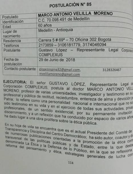 Velilla fue postulado por el ciudadano Gustavo López, representante legal de la Corporación Complexus, un centro para el desarrollo del pensamiento complejo que entre sus fundadores cuenta al filósofo español Fernando Savater y el expresidente Belisario Betancur.