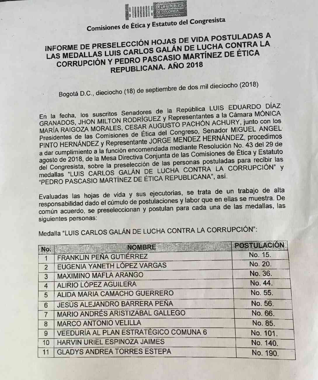 A pesar de las polémicas, la medalla Luis Carlos Galán al mérito por la lucha contra la corrupción fue aprobada por la Comisión de Ética del Congreso, que en los próximos días se le impondrá al actual presidente del tribunal ético del Centro Democrático.