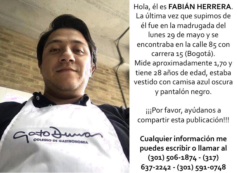 Si tiene información sobre el paradero de Fabián se puede comunicar a los siguientes números: 3015061874, 3176372242 y 3015910748