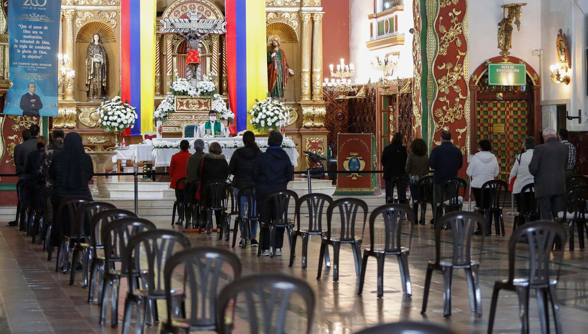 Foto: Guillermo Torres / SemanaA las siete de la mañana del 19 de septiembre, los habitantes del barrio La Soledad acudieron a la primera eucaristía celebrada en la parroquia de San Alfonso Maria de Ligorio -Señor de los Milagros después de meses de restricciones para prevenir el coronavirus. Las bancas de madera fueron sustituidas por sillas de plástico para mantener una distancia de dos metros entre cada feligrés.
