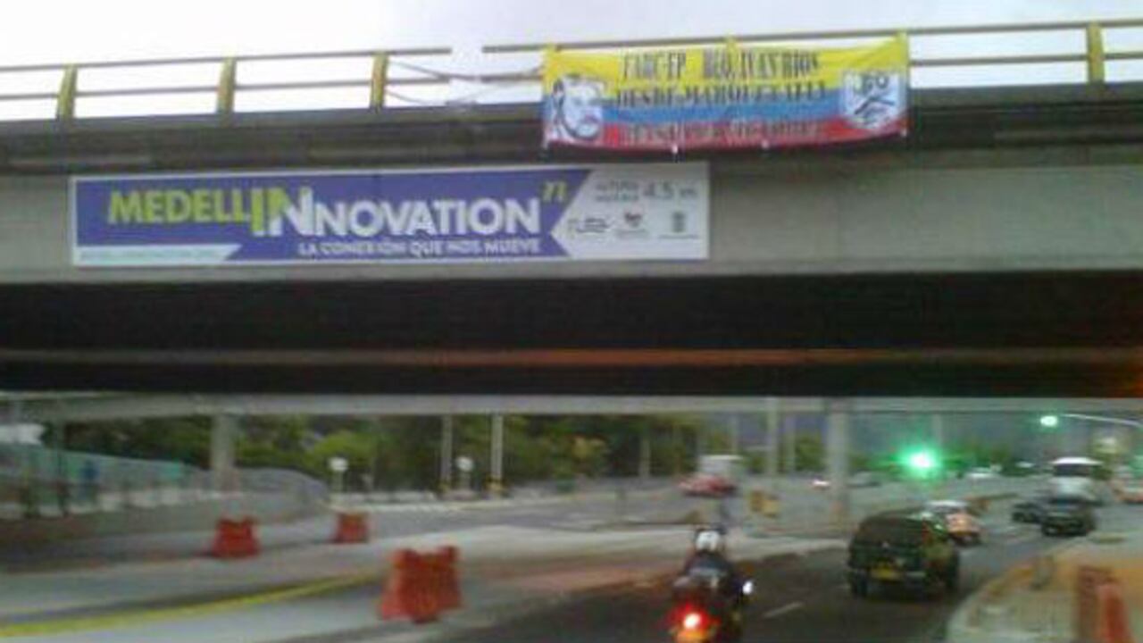 Dos banderas de las FARC fueron colgadas por ese grupo en dos sitios de masivo tránsito vehicular. Una de ellas fue amarrada al puente de Bulerías, donde confluyen la calle 33 y la avenida Bolivariana, muy cerca de la universidad Universidad Pontificia Bolivariana.