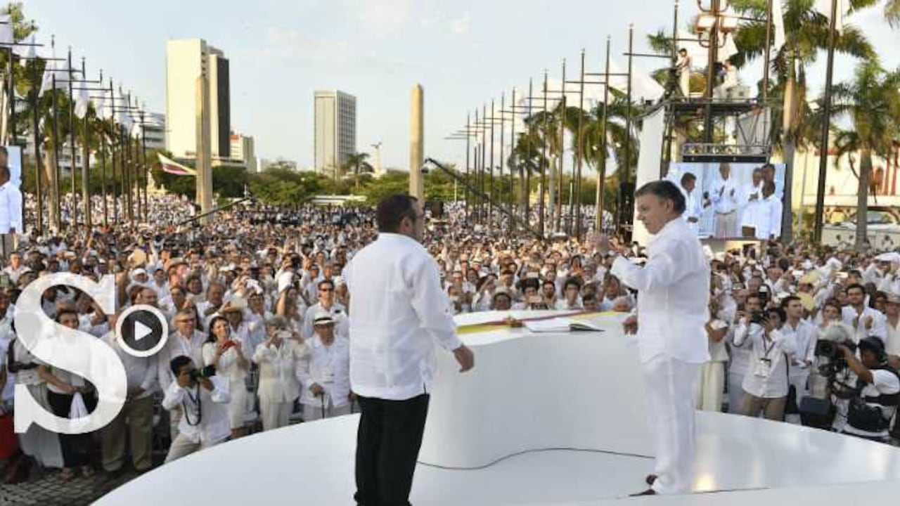 A las 5 de la tarde con 31 minutos, Juan Manuel Santos, en representación del Gobierno colombiano y Rodrigo Londoño, antes conocido como Timochenko, firmaban el documento que por fin ponía fin a un conflicto que duró más de cinco décadas. Como dato curioso, Londoño firmó como ‘Timo’, mientras que la rúbrica del presidente fue la que siempre utiliza en documentos públicos.