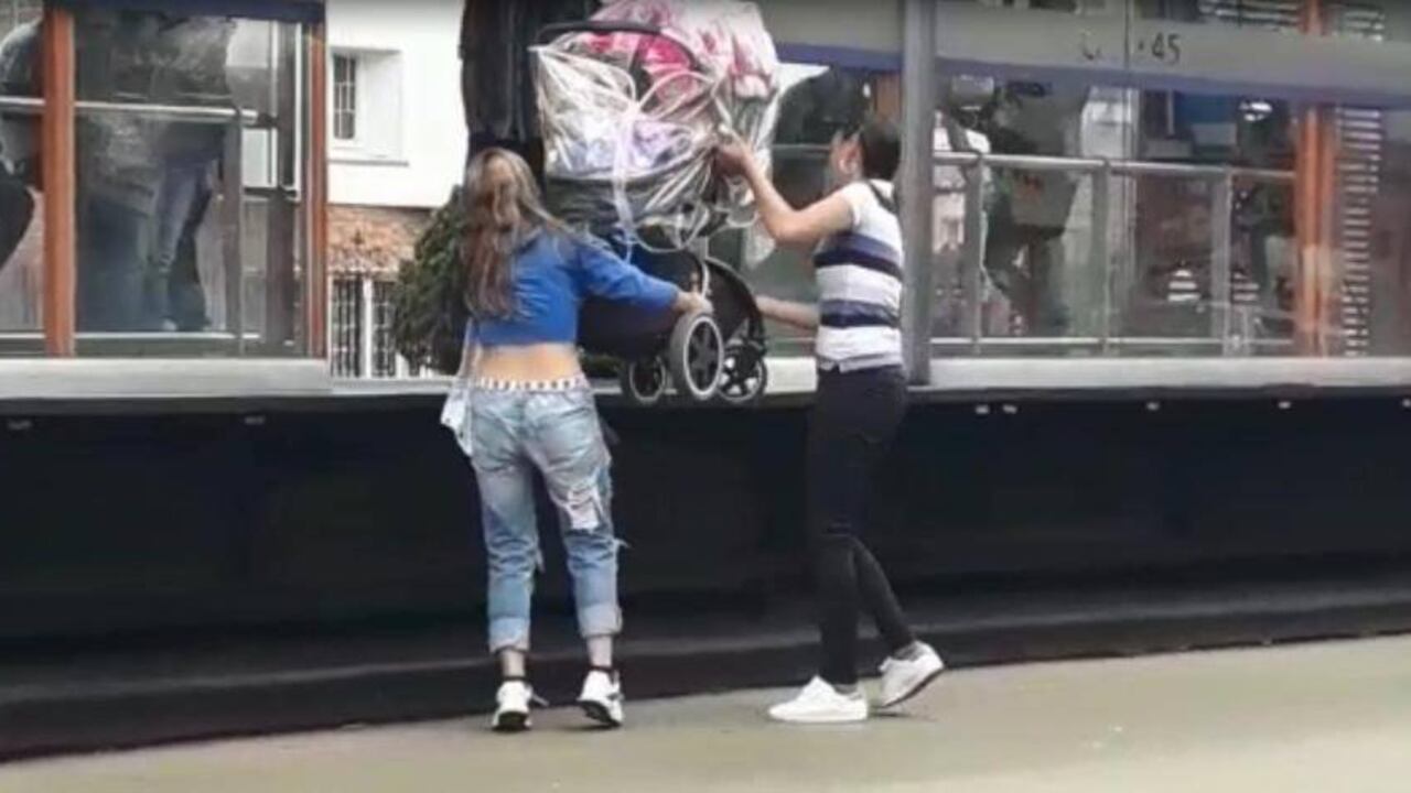 Lo singular de las imágenes es que en una arriesgada maniobra las mujeres también empujan un coche con un bebé en su interior. El hecho sucedió en la estación Calle 45 ubicada en la Troncal de la Caracas.