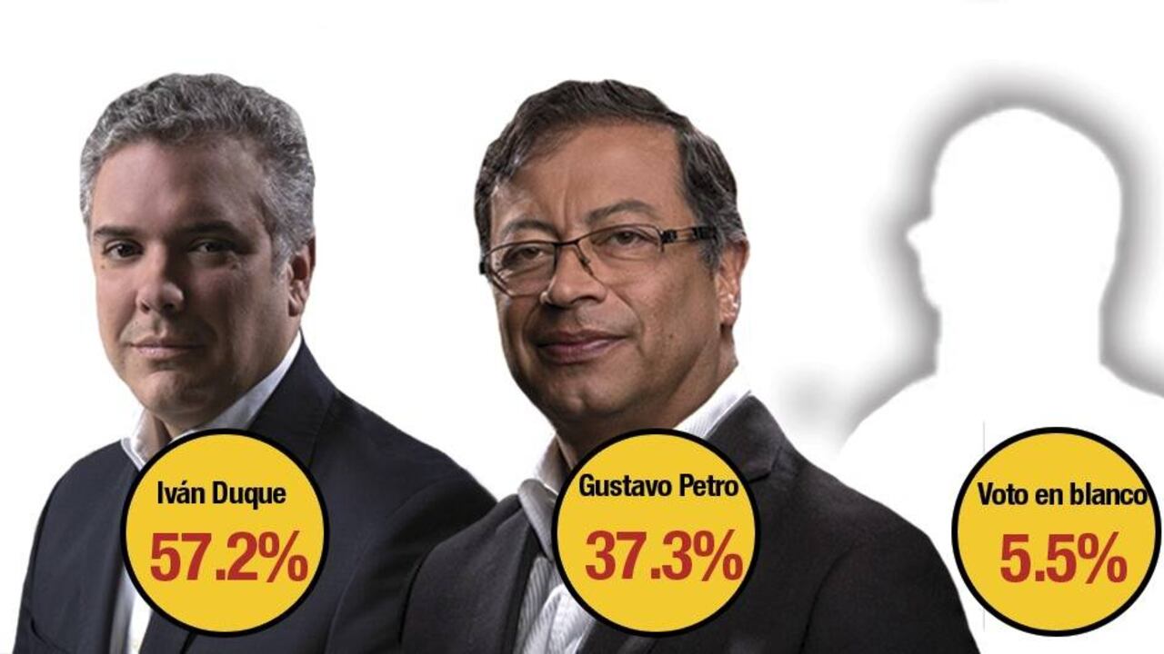 Los resultados obtenidos a una semana de las elecciones confirmarían la tendencia que se ha venido marcando desde el mes de marzo, después de las consultas y las elecciones parlamentarias: Duque se impondría a Gustavo Petro en una eventual segunda vuelta. Ahora, ante el escenario real, el candidato del Centro Democrático aumentaría en 3.7% su ventaja frente al de la Colombia Humana.