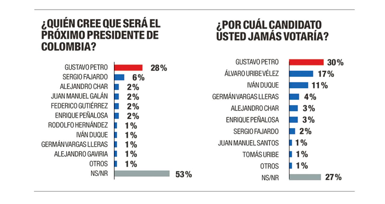 Bajo este panorama, y a menos de un año de la primera vuelta presidencial, el estudio electoral también indagó por la intención de voto. La principal noticia es que, por primera vez, el voto en blanco (26 por ciento) superó los números de todos los candidatos en competencia hasta ahora. Entre tanto, llama la atención el porcentaje de los que no quieren votar por ninguno de los aspirantes (24 por ciento). Un 4 por ciento todavía no sabe cuál será su decisión. Esos tres indicadores suman 54 por ciento, lo cual quiere decir que persiste una enorme incertidumbre sobre lo que puede ocurrir en 2022, y los votantes no se identifican todavía con las personas que buscan suceder a Iván Duque en la Casa de Nariño.