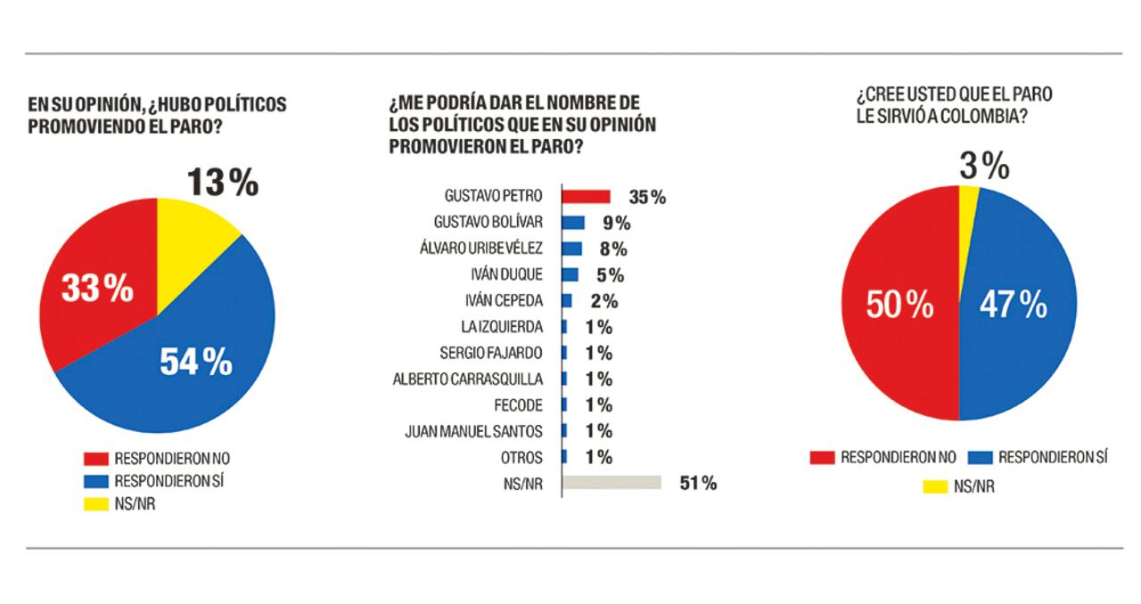 El 57 por ciento señaló que los principales efectos de las protestas fueron negativos: pérdida de vidas humanas (31 por ciento), pérdidas billonarias en la economía nacional (13 por ciento), bloqueos y destrozos en diferentes regiones del país (10 por ciento) y desempleo (3 por ciento). Por el contrario, para el 41 por ciento el paro tuvo resultados más positivos, como la caída de la reforma tributaria (30 por ciento), la protesta social de los jóvenes (8 por ciento) y la renuncia del ministro Carrasquilla (3 por ciento).
