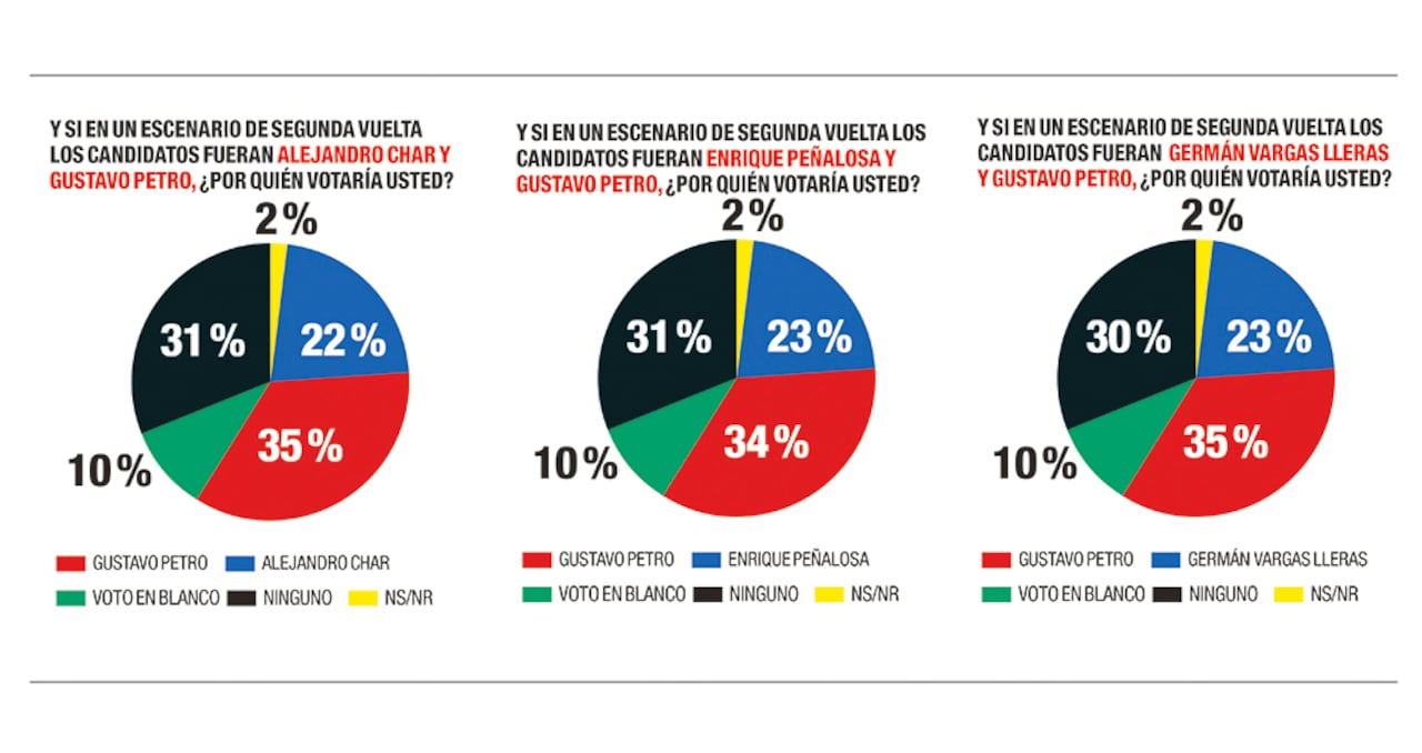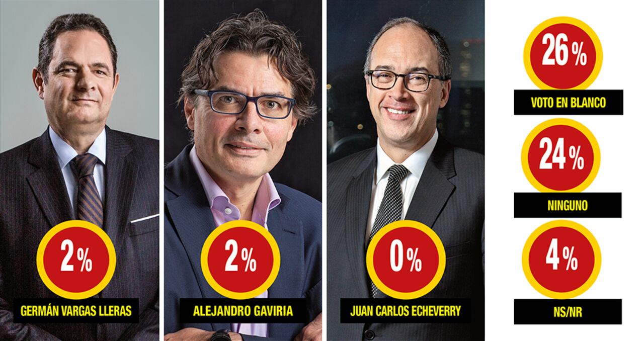 Los exalcaldes Federico Gutiérrez y Alejandro Char llegaron al 3 por ciento de la intención de voto; por su parte, Germán Vargas Lleras y Alejandro Gaviria registraron 2 por ciento. Juan Carlos Echeverry, exministro de Hacienda, marcó 0 por ciento.
