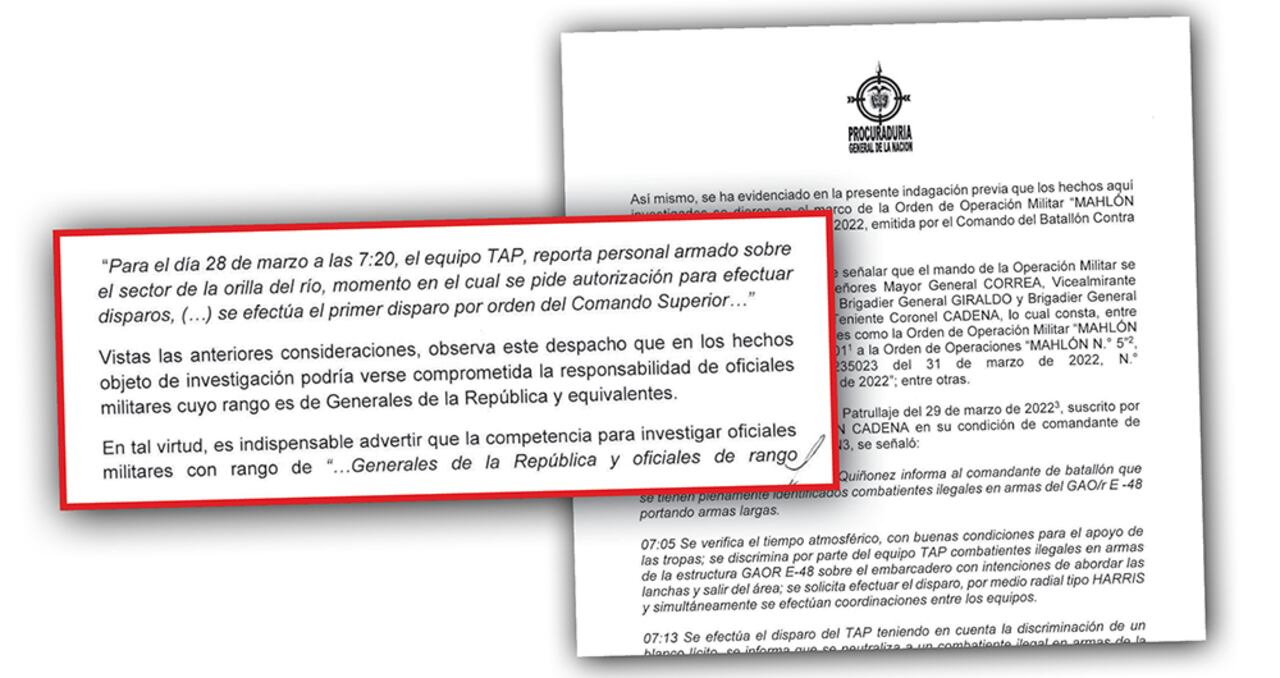 Precisamente en uno de los documentos, dirigido al comandante del Batallón contra el Narcotráfico n.° 3, el entonces teniente coronel Andrés Cadena, se refiere de esta manera: “Para el día 28 de marzo a las 7:20, el equipo TAP reporta personal armado sobre el sector de la orilla del río, momento en el cual se pide autorización para efectuar disparos; (...) se efectúa el primer disparo por orden del comando superior”. Ahí está justamente la nuez de la investigación que está dando un coletazo al más alto nivel. Según el documento de la Procuraduría que revela SEMANA, “observa este despacho que en los hechos podría verse comprometida la responsabilidad de oficiales militares cuyo rango es de generales de la república y equivalentes”.
