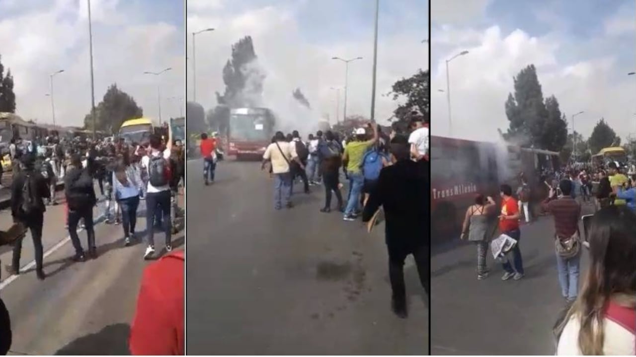 Sin embargo, en cuestión de minutos la manifestación se salió de control. Varios encapuchados se enfrentaron a la policía. Como se aprecia en un video, un vándalo lanzó un artefacto a uno de los articulados cuando los pasajeros intentaban salir en medio del humo.
