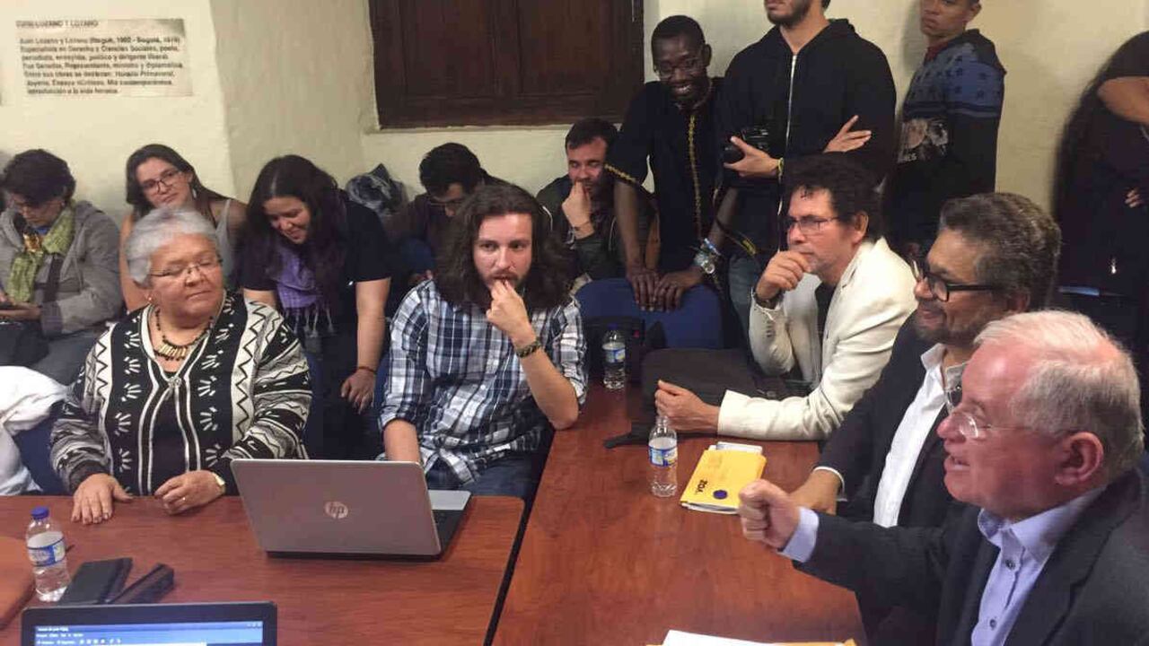 El senador Honorio Henríquez, compañero de pupitre de Bustamante, fue quien publicó una fotografía en la que se observa a Iván Márquez y Pastor Álape reunidos con un grupo de personas. Se supo, y se confirmó, que los jefes guerrilleros llegaron después de las 4:00 p. m. al centro de Bogotá. La reunión se adelanta en la Biblioteca del Senado, una casa en el barrio La Candelaria, ubicada en la carrera sexta con calle octava. A dos cuadras de la puerta por donde entran los congresistas al capitolio.