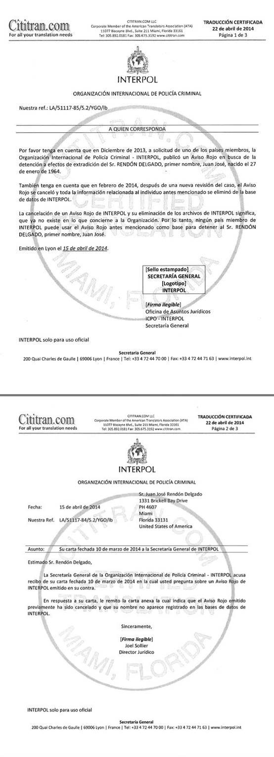 El tiempo pasó y el 10 marzo anterior la oficina principal de Interpol con sede en Lyon (Francia), expidió un certificado en el que asegura que el presunto caso contra Rendón no tenía mayor sustento y que hubo un uso inadecuado de la alerta roja emitida en su contra. Por lo tanto se archivaba y borraba cualquier anotación donde apareciera su nombre.