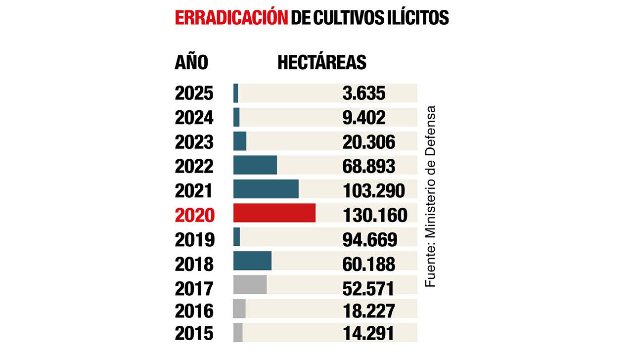 De hecho, hay un agravante: la erradicación se desplomó. Esta es la medida principal de lucha contra este flagelo, pues la Corte Constitucional prohibió la aspersión con herbicidas en 2015. Con base en las estadísticas del Ministerio de Defensa, se pasó de eliminar 103.290 hectáreas en 2021 a borrar del territorio 9.402 en el último año, es decir, una caída del 90,9 por ciento.