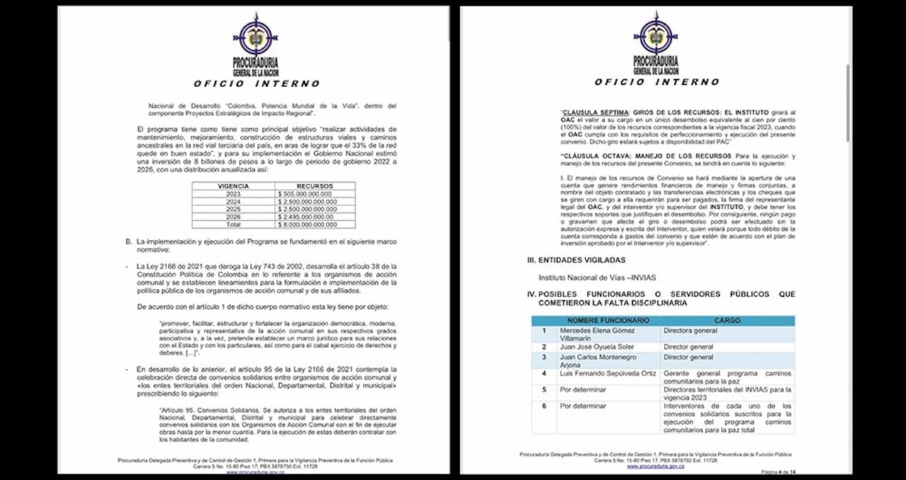 SEMANA obtuvo el oficio interno con el que la Procuraduría arrancó vigilando ese polémico programa y en el que aparecieron como posibles responsables de faltas disciplinarias Mercedes Gómez Villamarín, Juan José Oyuela y Juan Carlos Montenegro, quienes fungieron como directores del Invías. Asimismo, Luis Fernando Sepúlveda, quien fue el gerente de Caminos Comunitarios para la Paz Total.