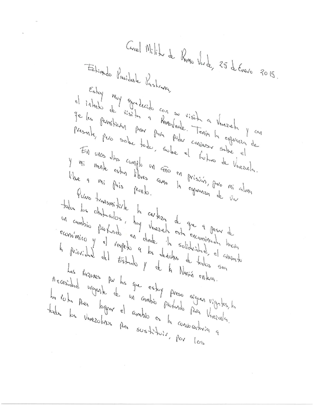 La carta está fechada el 25 de enero. En ella López le agradece al expresidente por su visita a Venezuela y confiesa que tenía la esperanza que los dejaran pasar “para poder conversar sobre el presente, pero sobre todo, el futuro de Venezuela”.