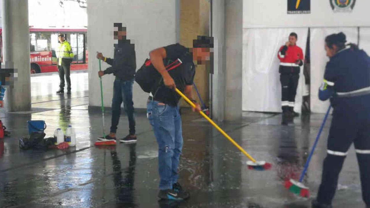 Este martes se realizó un operativo de la Policía de TransMilenio en el que fueron atrapados varios colados y se les obligó a limpiar la estación con escoba y jabón en mano. Una medida pedagógica que complementa la multa económica establecida en el Código de Policía con la que se espera que se reduzca la cantidad de infractores en el sistema.