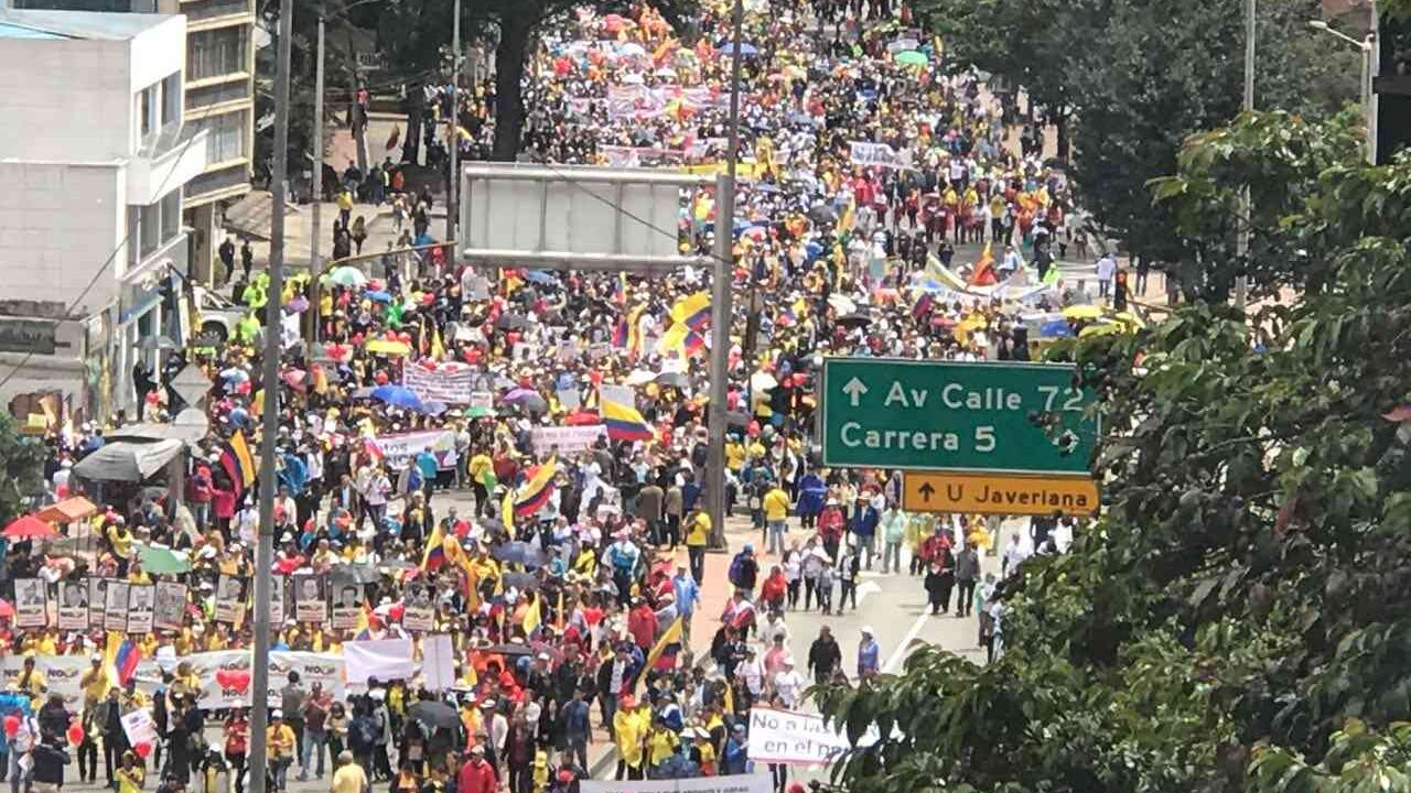 10:20 a.m: La marcha ya está en el Museo Nacional, en Bogotá, siguiendo su curso por toda la Carrera Séptima con destino a la Plaza de Bolívar. La multitud alega que el presidente Santos traicionó al país con el plebiscito.