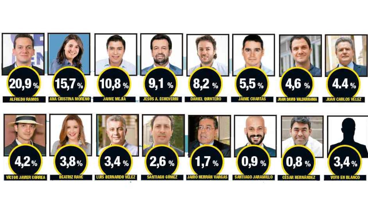 Sin embargo, la tendencia por movimientos independientes se quiebra en la última encuesta realizada por Invamer en la que las intenciones de voto para la alcaldía paisa se las lleva todas el Centro Democrático con sus precandidatos Alfonso Ramos (20,9 por ciento de intención de votos), Ana Cristina Moreno (15,7 por ciento) y Jaime Mejía (10,8 por ciento). Lo extraño es que todos son más bien desconocidos si se comparan con figuras como el concejal Jesús Aníbal Echeverri (cuarto en la lista), el exsecretario de Inclusión Social Luis Bernardo Vélez.