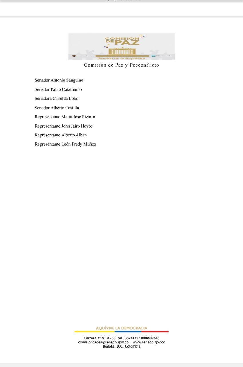 Aunque la misiva fue enviada como un documento institucional de la comisión de paz del Congreso, solo está firmada por los congresistas Édgar Díaz y Richard Aguilar, de Cambio Radical; Iván Cepeda y Alberto Castilla, del Polo Democrático; Antonio Sanguino, del Partido Verde; Roy Barreras, del Partido de la U; y Pablo Catatumbo, Griselda Lobo y Luis Alberto Albán, del partido Farc.