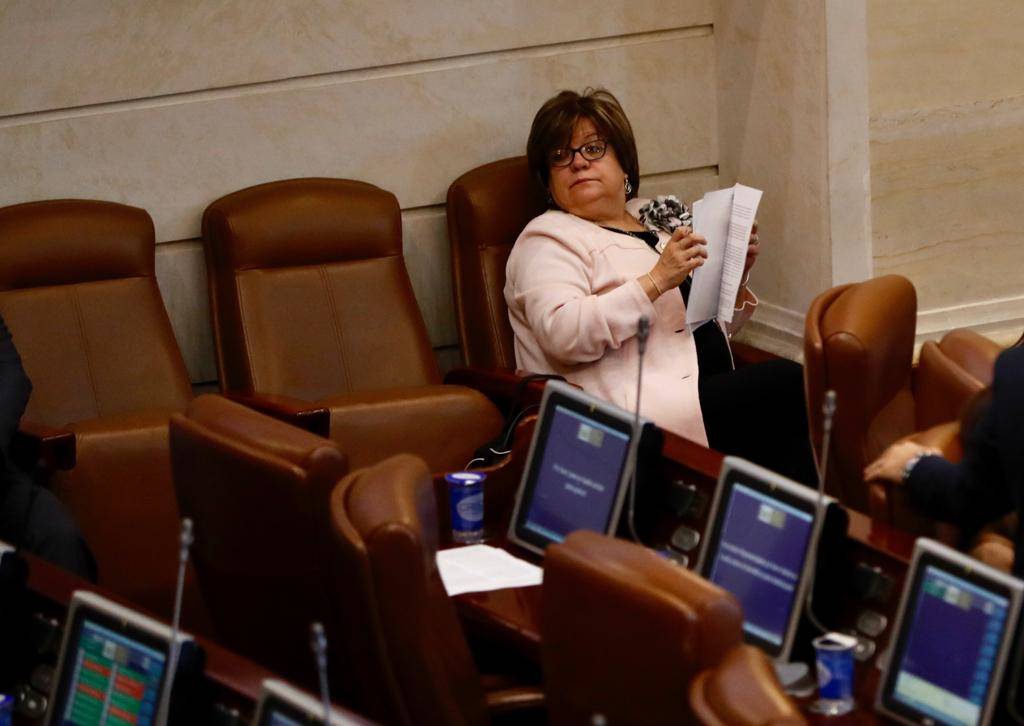 Recién llegada de las negociaciones con la minga indígena, la ministra del interior, Nancy Patricia Gutierrez, ingresa al recinto de la cámara de representantes para ponerse al frente del trámite de las objeciones.