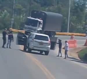 En los videos que circulan por redes sociales se observa a un sujeto vestido con camiseta blanca, pantalón oscuro y gorra blanca, amenazando a los transeúntes con un arma de fuego. En ese momento, se ve cómo es desviado un vehículo de carga larga por los subversivos.