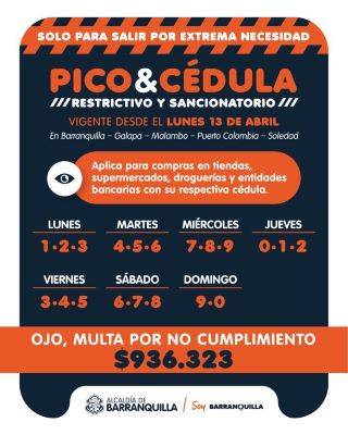 Para reducir más el número de personas que circulan por las calles y con esto disminuir la posibilidad de contagio de la covid-19, en Barranquilla rige desde este lunes una nueva medida de pico y cédula. Hasta este lunes, el Instituto Nacional de Salud había confirmado 66 casos de coronavirus en la ciudad y 22 más en otros municipios del departamento del Atlántico.