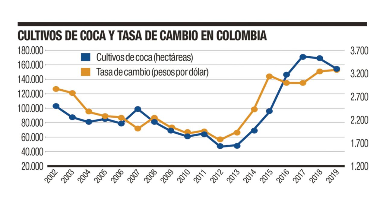 La correlación en las cifras agregadas parece indicar que los cultivos de hoja de coca se ven afectados por las fluctuaciones de la tasa de cambio al influir de manera directa las ganancias que obtienen productores y traficantes. Mientras que entre 2002 y 2012, cuando se dio una marcada revaluación del tipo de cambio, los cultivos ilícitos disminuyeron, en los años posteriores aumentaron, pari passu con el aumento en el precio del dólar.