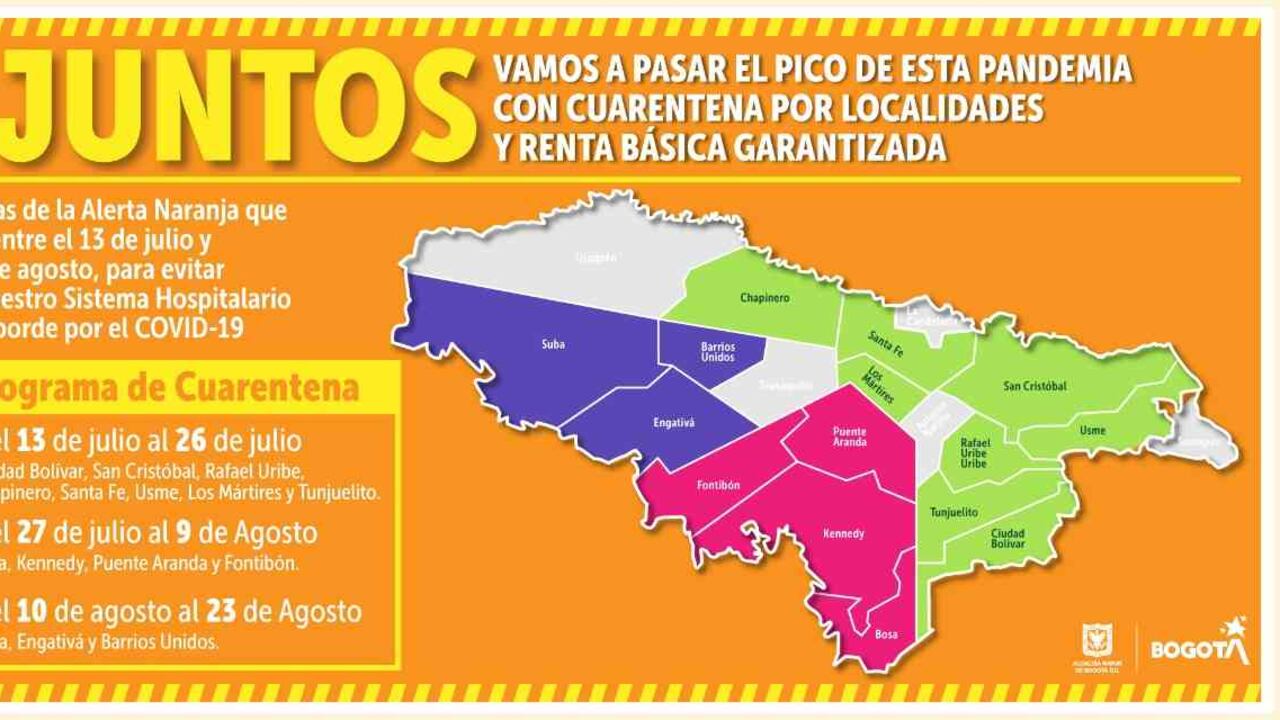 "Las pocas localidades que no están incluidas es porque tienen, relativamente, bajo nivel de contagio", señaló la mandataria. Se refería a Usaquén, Teusaquillo, Antonio Nariño, Candelaria y Sumapaz, las cuales están demarcadas con color gris en la gráfica presentada y no tendrán que someterse al confinamiento riguroso que comienza este 13 de julio. Pero, ojo, eso de ninguna manera significa que no deban cumplir con el distanciamiento social, el uso obligatorio del tapabocas, lavado de manos frecuente y el pico y cédula que siguen vigentes. Como lo dijo López, estas localidades podrían entrar a cuarentena si las condiciones de contagio de covid-19 aumentan, al igual que la mortalidad.