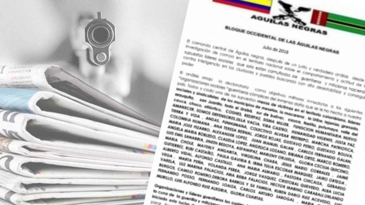 Según la organización, el fin de semana se difundió un panfleto, al parecer, firmado por el Bloque Central de Las Águilas Negras en el que se amenazaba la integridad física de la periodista Jineth Bedoya y dos colegas de La Silla Vacía. Las profesionales habrían sido señaladas como pertenecientes a la guerrilla y se les declaró objetivo militar.