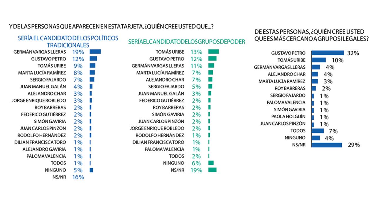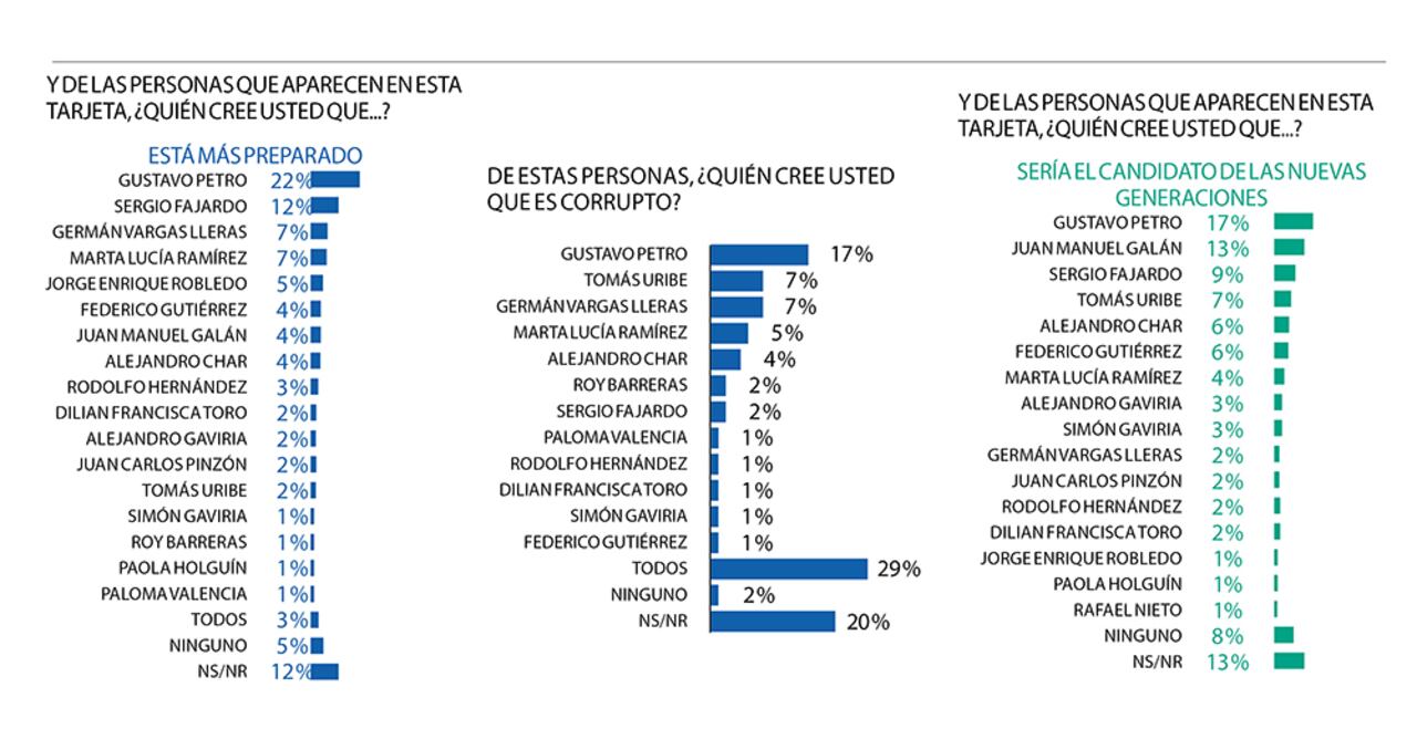 La muestra brinda varios indicadores negativos en los que Petro también aparece de primero: el 32 por ciento considera que sería un mal presidente, otro 32 por ciento lo ve como el candidato más cercano a los grupos armados ilegales y un 17 por ciento asegura que supuestamente es corrupto. Es decir, esos números evidencian que su mayor desafío será conquistar a las personas cuyo nombre les genera resistencia.