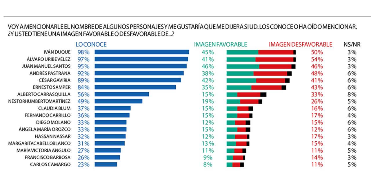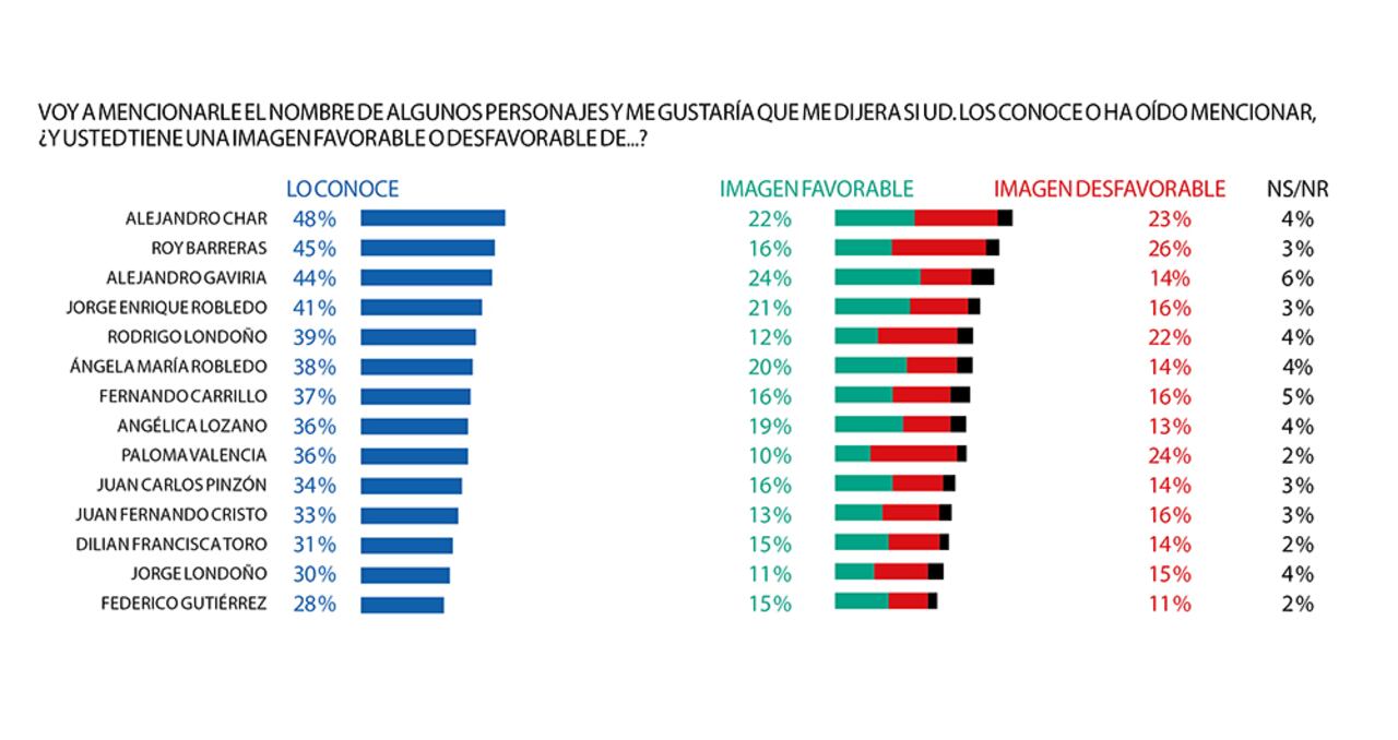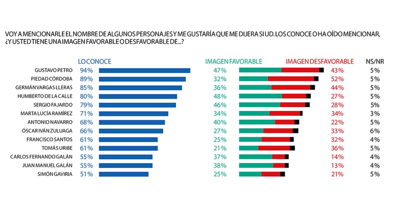 Por el contrario, quien sale muy bien posicionado como eventual fórmula vicepresidencial es el exsenador Juan Manuel Galán, en el segundo escalafón después de Fajardo. Además, junto con su hermano, el concejal Carlos Fernando, son los líderes políticos que tienen la menor imagen desfavorable en todo el país.
