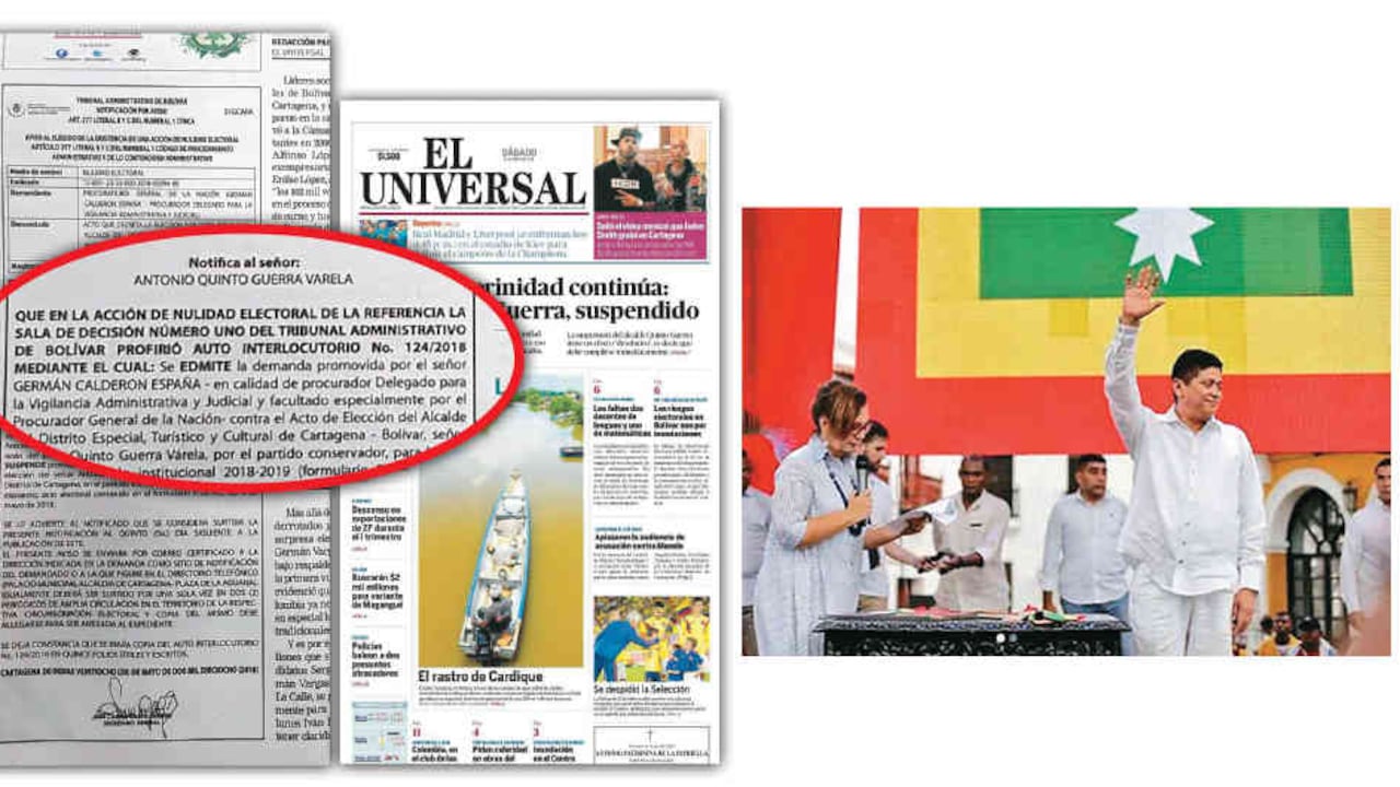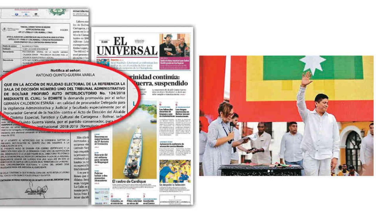 Guerra se posesionó el 11 de mayo, pero el procurador delegado para la vigilancia administrativa, Germán Calderón España, demandó su elección y pidió suspenderlo del cargo. El Tribunal Administrativo de Bolívar aceptó esa solicitud mientras se adelantan las investigaciones y decisiones de fondo. Vale aclarar que sobre esta elección hay seis demandas más interpuestas por otros tantos ciudadanos. Finalmente, Guerra quedó suspendido el 24 de mayo pasado, pero lo increíble es que tuvieron que notificarlo por aviso en los diarios El Universal y El Heraldo el miércoles de esta semana, pues el funcionario del tribunal no pudo hallarlo en la Alcaldía en reiteradas ocasiones. Solo el próximo martes 5 de junio se cumplirá el término de cinco días legales para que la decisión quede en firme.