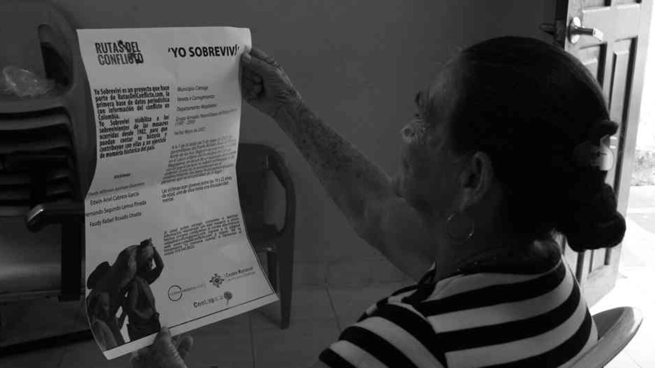 O.P.: Con el objetivo de mover los datos hacia la gente, lo primero que se nos ocurrió fue, con “Yo sobreviví”, coger toda esta información que estaba en la base de datos en internet e imprimirla o llevarla a radios comunitarias a los lugares donde ocurrieron más masacres. Pensando en que la mayoría de personas en región no acceden a internet para informarse. Tratamos de mover la información de lo digital, un poco, a lo análogo y luego invitar a la gente para que participara.