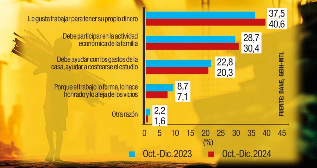 Menores trabajan actualmente en Colombia, 1.000 más que al cierre de 2023. De ese total, 174.000 viven en los centros poblados y rurales dispersos, y 137.000 en las cabeceras.