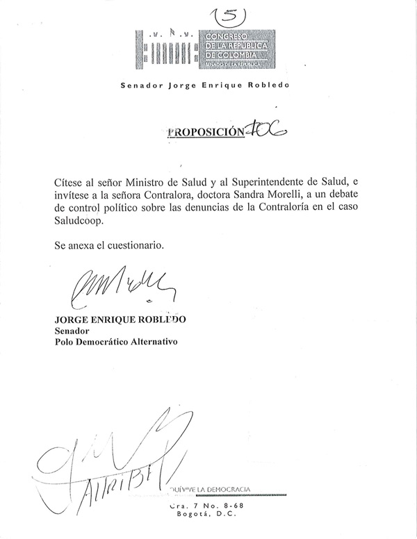 El senador Jorge Robledo, referente del partido, citó al ministro de Salud y al Superintendente de Salud, para que respondan sobre las denuncias que ha hecho la Contraloría sobre el caso de la EPS Saludcoop. El senador del Polo además invitó a la contralora Sandra Morelli, que para esos días estará adportas de salir del organismo de control.
