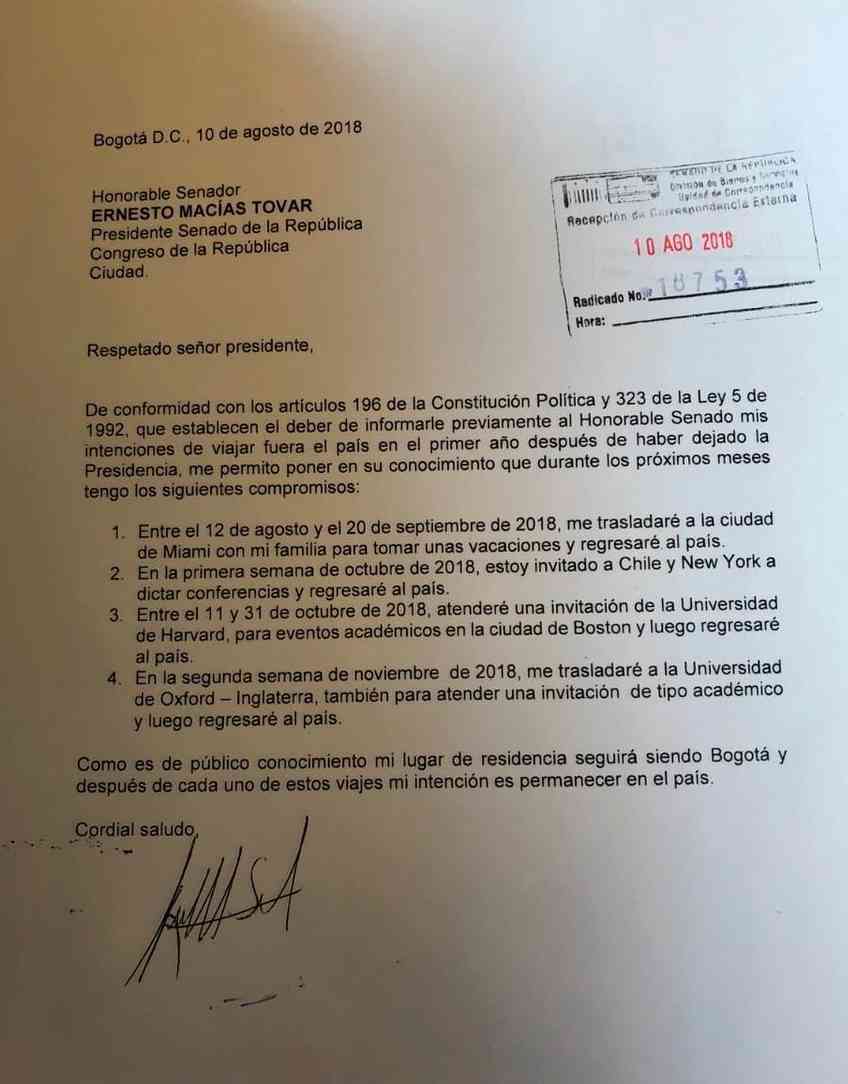 Se conoce la carta que Santos envió a Macías informando de su viaje y que fue radicada el 10 de agosto –dos días antes de salir del país-. Sin embargo, tal como relata Macías y el secretario del Senado Gregorio Eljach, el problema estuvo en los tiempos. La carta fue radicada el viernes a las 4 pm en Correspondencia, por tanto solo llegó al presidente del Congreso el lunes a las 10 de la mañana, cuando Santos ya se había ido a Miami.