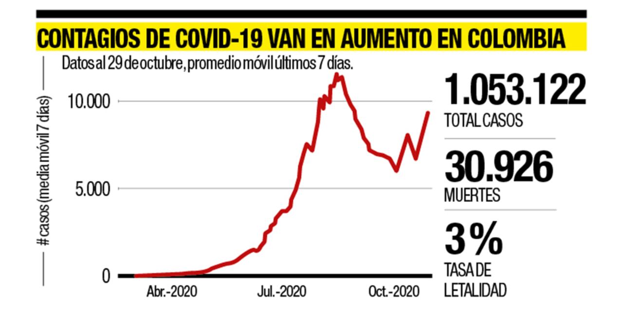 El gran interrogante no es si la segunda ola llegará a Colombia, sino cuándo. Hay indicios preocupantes. Entre el 18 y el 24 de octubre, la covid-19 fue la primera causa de muerte en el país. Esta semana, incluso, la curva de contagios no bajó, sino que comenzó a subir de nuevo. Este jueves llegaron a 11.187 casos, niveles no registrados desde agosto. El número de muertos en el país superó ya los 31.000, y el de contagios pasa de un millón.